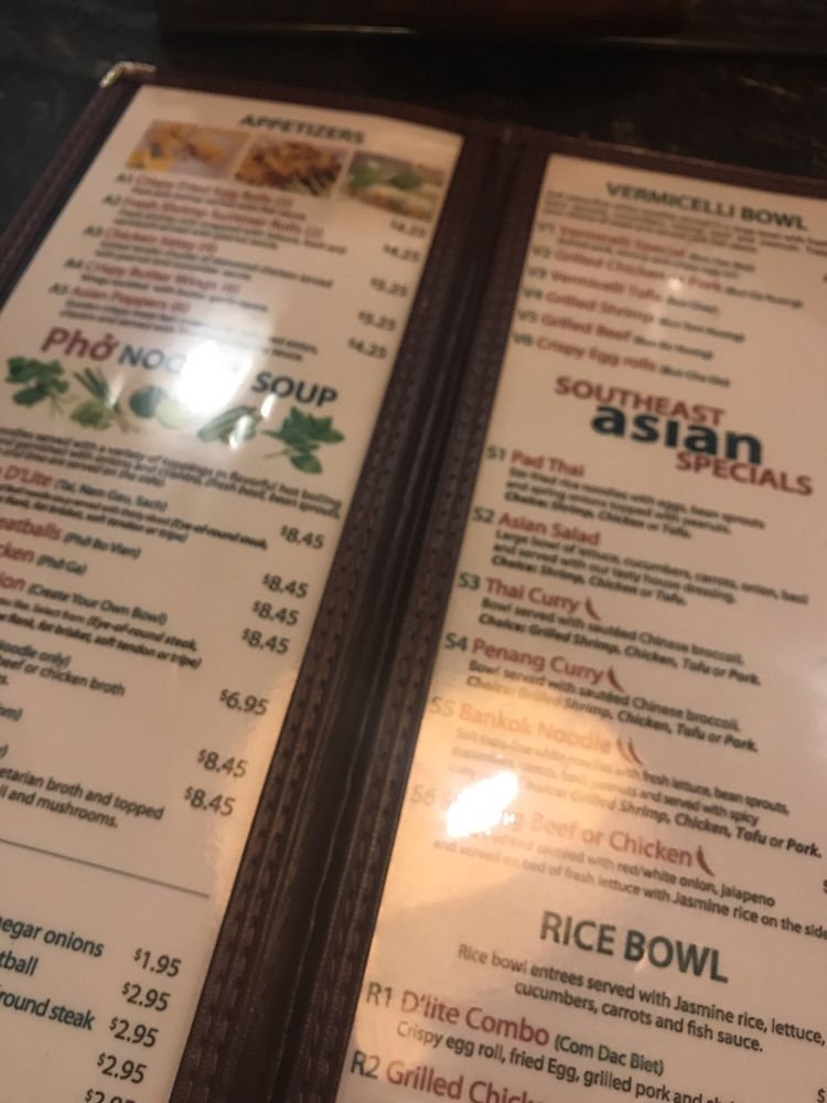 Located in Bowie, MD, Pho D’Lite offers a delightful blend of Asian Fusion, Thai, and Vietnamese cuisine. With a wide range of options including vegan and vegetarian choices, this restaurant is perfect for groups, families, and solo diners alike. The vibrant interior and courteous service create a welcoming atmosphere for all guests. Customer reviews rave about the attentive staff, particularly mentioning standout server Jason.